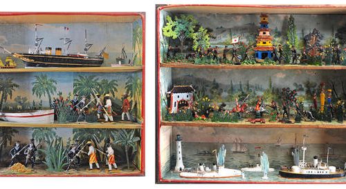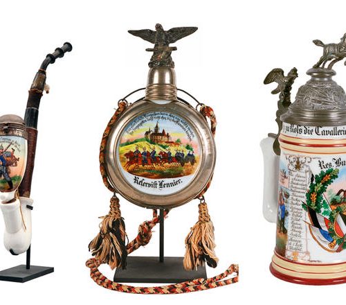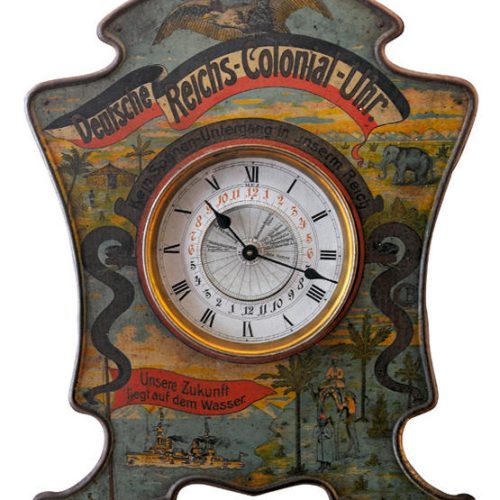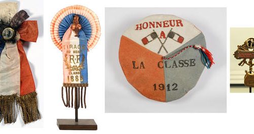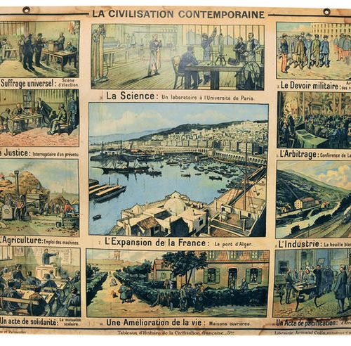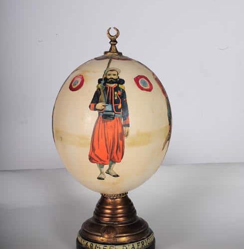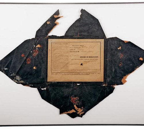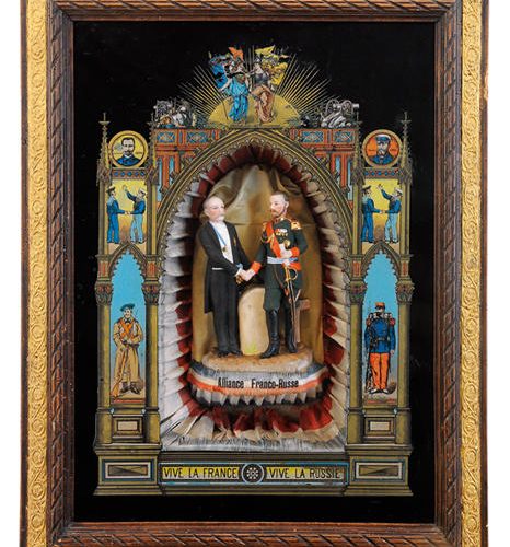Part One: The world before 1914 and the outbreak of war© Paper and wax. N° inv. : 3 ECO 4.1. Coll. Historial de la Grande Guerre – Péronne (Somme). Photo Yazid Medmoun – Envelope containing French posters relating to the general mobilisation. The package contains one rarely-preserved item: the envelope which contained these four posters (the general mobilisation was announced on 1st August and came into effect on the 2nd), addressed to the mayor of Villiers-Sur-Chize, in the Deux-Sèvres département. The envelope is made of opaque, black paper, as if in mourning at the advent of war.© Bronze. N° inv. : 1 OBA 1.1. 900 mm x 550 mm x 430mm. Coll. Historial de la Grande Guerre – Péronne (Somme). Photo Yazid Medmoun – La Paix Armée. Winner of a Gold Medal at the Universal Exposition 1900, Félix Alfred Desruelles sculpted this peculiarly graceless allegory of ‘Peace Bearing Arms.’ The complex web of alliances, the arms race and the transformation of the military capacities of the great powers all conspired to put pre-War Europe in a state of “armed peace.” In this piece, danger is kept at bay by a generously-proportioned Marianne figure, solemnly surveying the horizon; in her left hand she firmly grips both an olive branch and the symbolic national sword of France, its point resting on a book. Law and justice? Culture and civilisation?© Paper. 970 mm x 1170mm. N° inv. : 17 MAS 1.1. Coll. Historial de la Grande Guerre – Péronne (Somme). Photo Yazid Medmoun – School poster entitled ‘Contemporary Civilisation.’ Designed to be hung on the walls of French schools, this poster was the work of Ernest Lavisse, “official historian” of the Third Republic. In the central panel, the “expansion of France” features a sweeping view of the port at Algiers, the pride of “Greater France.” The panel immediately above celebrates Science (in France); below, the improved living conditions of the working classes. To either side, progress in both agriculture and industry. Other panels deal with less tangible advances: universal (male) suffrage and conscription; justice and international arbitration (the Hague Convention of 1899); solidarity (the schools’ mutual fund) and social order (the Arras Convention of 1891 whereby the State, for the first time, imposed arbitration to settle a labour dispute in the coalfields). All in all, this panorama exalts a naive faith in the ideal of progress, typical of Republican liberalism in the pre-War years. And of course, an unshakeable faith in that beacon of “contemporary civilisation:” France.© Oil on canvas.1010mm x 810mm. N°inv. : 14 FI 44. Coll. Historial de la Grande Guerre – Péronne (Somme). Photo Yazid Medmoun – L’Alsace-Lorraine after 1870. The Myth of Alsace-Lorraine, a myth of Revenge. This painting by Joseph Aubert was completed in 1919 and is entitled ‘The Protestors’. It is one half of a diptych whose other panel is entitled ‘The Liberators’ (the original, formerly on display at the Musée de l’Armée, was destroyed by the Germans in 1940). The painting is a retrospective evocation of the trauma of the “Lost Provinces” taken from France (two Germans are here seen leading away Alsace in chains, while Lorraine prays in the background and, in the foreground, a French soldier who bears a suspicious resemblance to Napoléon III has failed to stop the abduction). Now that the “Lost Provinces” had been restored to France following the victory of 1918, it was time to celebrate the Frenchmen who opposed their loss in 1871: here represented by a group of officers among whom we can recognise the likenesses of Déroulède, Faidherbe, Chanzy and Keller, alongside Gambetta, Clemenceau and Freycinet. This cloying, somewhat misleading allegorical scene hammers home the idea that Alsace and Lorraine were never forgotten or abandoned by the motherland.© Lead and card. N° inv. : 29 JOJ 1.1 et 4.1. 285 mm x 290 mm x 70 mm / 345 mm x 478 mm x 75 mm. Coll. Historial de la Grande Guerre – Péronne(Somme). Photo Yazid Medmoun – Box of toy soldiers representing the conquest of Madagascar and the Russo-Japanese war. Military actions were a popular subject for toys and games – and thus figured prominently in the imagination of French children – long before the outbreak of war in 1914. These two boxes of toy soldiers, complete with exotic décors, are testament to this popularity: the first (left) evokes the French conquest of Madagascar, initiated in 1883 then taken up again in 1895, until the island was formally annexed in 1896; the other represents the Russo-Japanese war of 1904-1905, both at sea and on land, in Manchuria. Familiarisation with warlike activities and the derealisation of violence here go hand in hand.© Egg. N° inv. : 240 mm x 120 mm. Coll. Historial de la Grande Guerre – Péronne(Somme). Photo Yazid Medmoun – The African Army. The term ‘African Army’ (French L’armée d’Afrique) was used to refer to all of the French military units stationed in North Africa, including the Zouaves and Spahis featured on this ostrich egg. This item is testament to the military dimension of the “French colonial ideal,” with a martial aesthetic comparable to that which prevailed in mainland France. That aesthetic was definitively destroyed by the harsh realities of modern warfare.© Painted metal. N° inv. : 6 ISC 2.2. 365 mm x 300 mm x 80mm. Coll. Historial de la Grande Guerre – Péronne (Somme). Photo Yazid Medmoun – German colonial clock – Reichs Colonial Uhr. This item, manufactured in the early years of the twentieth century by the Badische Uhrenfabrik Furtwangen, brings the technique and decorative tradition of the watchmakers of southern Germany to bear on two objects of contemporary fascination: universal time and colonial expansion. A ribbon in the red, white and black of the national flag, presided over by an imperial eagle, bears the legend: “Colonial clock of the German 