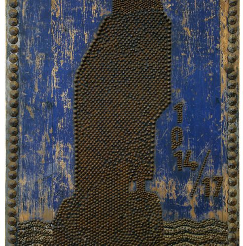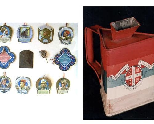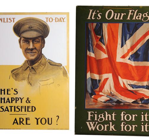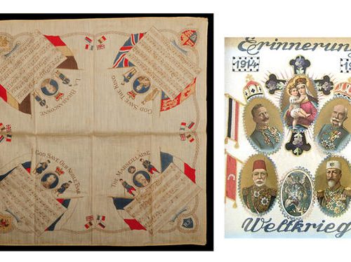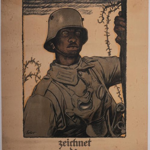 Part Three: Conducting the war© N° inv. : 2 AFF 7.3. Coll. Historial de la Grande Guerre – Péronne(Somme). Photo Yazid Medmoun – British recruiting posters, “It’s our flag…” and “Enlist to-day.” The United Kingdom had a professional standing army at the outbreak of the war, but Lord Kitchener, appointed Minister of War in Asquith’s government on 3rd August, was convinced that the war would be long and destructive. He immediately set about recruiting volunteers on a vast scale: one million men signed up in 1914 alone, followed by more than a million-and-a-half in 1915, and the inevitable recourse to conscription after January 1916. The Union Jack poster simply reminds the viewer of his patriotic duties in a general sense: to fight for it, and to work for it (for those not directly involved in the combat). The image of the smiling soldier (“happy & satisfied”), on the other hand, aims to inspire guilt in those staying out of the fray while others risk their lives. Posters of this kind, published with parliamentary backing to further the recruitment drive, made use of the very latest in contemporary advertising techniques. Nevertheless, recent research has suggested that the use of advertising may actually have been counter-productive: the idea that voluntary enrolment was something to be marketed and “sold” could be perceived as tarnishing the high moral value of this patriotic act. The propaganda machine duly changed tack, returning to more traditional and discreet methods to encourage young men to sign up.© N° inv. : 17 AVE 14.3 et 18 DEC 1.2. Coll. Historial de la Grande Guerre – Péronne(Somme). Photo Yazid Medmoun – Kerchief featuring the national anthems of the Allies, and embroidered portraits of the four heads of state of the Central Powers. This British kerchief features the national standards of the Allies – Great Britain, France, Russia and Belgium – along with their national anthems. Symbols of patriotism were thus proudly displayed on one’s clothing, and about one’s person. On the other side, patriotism was more concentrated on the person of the head of state (here the leaders of Germany, Austria-Hungary, Bulgaria and the Ottoman Empire), watched over in this example by a Virgin with Child which reflects the Catholic origins of this embroidery, produced during the war.© N° inv. : 3 AFF 34.2. Coll. Historial de la Grande Guerre – Péronne(Somme). Photo Yazid Medmoun – German poster, drawing by Fritz Erler. The soldier in his steel helmet rapidly became an iconic figure. This poster is an advertisement for the 5th round of German war bonds (1917). Until 1917, German propaganda for war bonds had avoided showy iconography and typography, regarded as being undignified for such official proclamations. But the response to the 4th bond issue had been mediocre, and the authorities were obliged to make concessions. Lucian Bernhard’s poster for the 5th bond issue makes successful use of simple, striking graphic design inspired by the latest advances in advertising. Under the title “Help us to win! Sign up for war bonds,” this image of a soldier painted by Fritz Erler (1868-1940) marked a real turning point. The image was subsequently used on posters and postcards, and contributed to the financial success of the operation (which raised 13.1 billion Marks, a record). Above all, it became an iconographic archetype both during and after the war. The muted colour palette of greys and greens, the distinctive attributes of the industrial-era warrior (steel helmet, gas mask, shears), and the minimalist backdrop, which features nothing but barbed wire, all contribute to sense of realism consistent with the new aesthetics of war. The hieratic expression of the soldier, however, adds a sense of transcendence. His eyes are fixed firmly on the horizon, but what does he see there? Is it victory ? Or death? Perhaps it is this sense of ambiguity which explains the enduring fascination of this image of the soldier in his steel helmet, which had rapidly become the abiding symbol of these new men, forged in the flames of warfare on an industrial scale.© N° inv. : 20 FI 1. Coll. Historial de la Grande Guerre – Péronne(Somme). Photo Yazid Medmoun – Eagle of nails from a German school, with the slogan “Our future lies on the water.” In the early days of the war, a trend had spread across Germany which involved driving nails into wooden boards or statues to symbolise donations made to the war effort, or one of the country’s many charitable organisations. In Berlin, nails could be driven into the greatcoat of a monumental statue of Hindenburg erected on Königsplatz: nails of steel, silver and gold were available to buy for this purpose. In other towns, statues of heroic figures such as Roland were erected for the same end. Designed to inspire spontaneous generosity in civilians, many of these devotional objects were more modest in form. This panel was hung on the wall of a school, and measures 83cm by 58cm. The pupils have created an image of a black eagle, official symbol of the German Empire. Picked out against the blue backdrop is a slogan pertaining to Germany’s foreign policy – “Our future lies on the water” – a quotation taken from Wilhelm II’s address at the inauguration of the port of Stettin. Created in 1917, with submarine warfare once again raging since 1st February, this item is testimony to the popular support for government policy, and the persuasive power of the argument that Germany had a right to her own “place in the sun.” (von Bülow).© N° inv. : 9 MED 8.1 et 8 MTC 2.1. Coll. Historial de la Grande Guerre – Péronne(Somme). Photo Yazid Medmoun – Insignia of the colonial army (France) and donation box commemorating Serbia Day on 25 June 1916. Within all of the warring countries, national days of celebration were an important means of rallying public support, financially as well as in terms of general mor