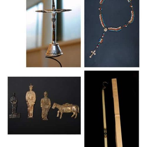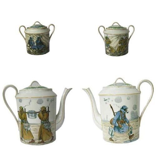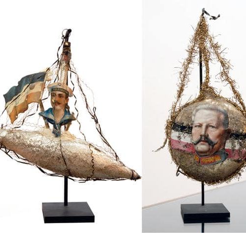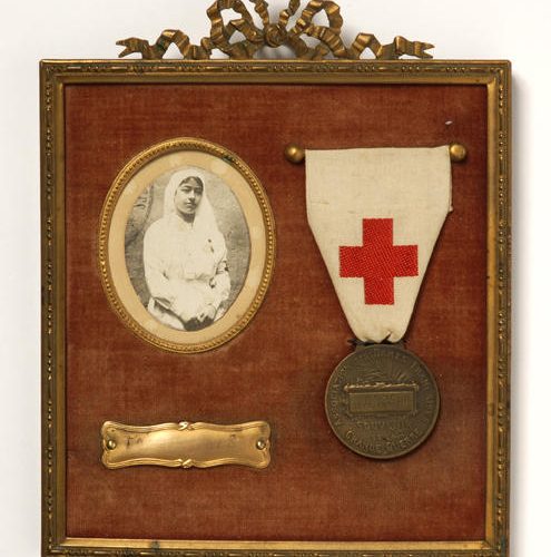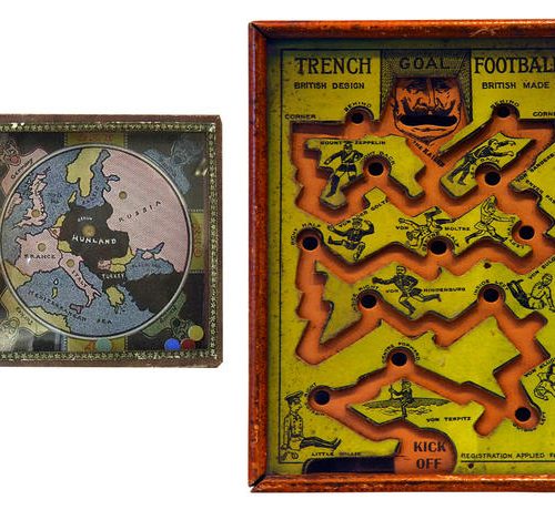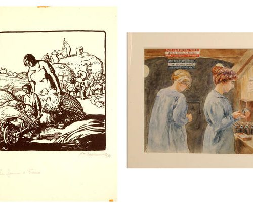 4 - Vierde deel Binnenlandse fronten en oorlogscultuur© Lithografie en aquarel. Inv. nr : 4 FI 338 en 11 FI 185. Coll. Historial de la Grande Guerre – Péronne(Somme). Foto Yazid Medmoun – Auguste Lepère, “De vrouwen van Frankrijk” – Cabaut. De kunstenaars, “gemobiliseerd” door het ministerie van Informatie en betrokken bij de oorlogsinspanning, roepen hier de oogst en de vervaardiging van granaten op. Deze werkzaamheden werden in de Grote Oorlog aan vrouwen toevertrouwd. Twee gezichtspunten, die uitdrukking geven aan de nieuwe situatie voor vrouwen.© Inv.nr : 5 DEC 17.1.Coll. Historial de la Grande Guerre – Péronne(Somme). Foto Yazid Medmoun – Franse verpleegstersmedaille. In de met velours bedekte lijst is het portret van een jonge vrouw, een herdenkingsmedaille van de Association des Dames françaises en de datum 1914-1918 te zien. Het betreft het leven van een vrouw die gemobiliseerd werd tijdens de oorlog, een vrouwelijke oorlogservaring, aangezien vrouwen niet mochten vechten, iets dat sommigen, vooral onder de verpleegsters, zeiden te betreuren. De geslachtsbarrière is hier extreem nauwkeurig toegepast, maar het jonge meisje heeft een inlijsting gemaakt die op alle punten vergelijkbaar is met de inlijstingen die door zoveel overlevende soldaten zijn samengesteld.© Inv.nr : 13 ART 1.3. Coll. Historial de la Grande Guerre – Péronne(Somme). Foto Yazid Medmoun – Britse brievenbus. Deze Engelse, bijzonder rudimentaire, brievenbus beeldt veel meer uit dan alleen zichzelf: de bus is het symbool van een vitale, en soms dagelijkse, band van miljoenen mannen met degenen die ze zich tot taak hadden gesteld om te verdedigen, hun “eigen mensen” die ze achtergelaten hadden aan het thuisfront. In rustige periodes konden de soldaten wel een brief per persoon per dag schrijven, soms zelfs meer. In Frankrijk werden tijdens de hele oorlog miljarden brieven verstuurd. Omdat aan de vooravond van de oorlog praktisch volledige alfabetisering tot stand gebracht was in West-Europa, hadden vrijwel alle soldaten voor het eerst in de geschiedenis de mogelijkheid te schrijven. Ze konden op die manier voortdurend communiceren met degenen die ze verlaten hadden. Overigens werd elke onderbreking van de post als iets ondraaglijks ervaren. In de brieven stond ook nieuws over degenen die uit dezelfde plaats afkomstig waren, de inhoud was bestemd om te worden verspreid buiten de familiekring. Ze waren voor de mannen ook een middel om controle te houden. Zo runden ze op afstand hun boerenbedrijf of winkel, adviseerden ze hun vrouw en gaven bevelen, gaven standjes aan hun kinderen of moedigden ze aan. In een soort van vage “contra-propaganda” praatten ze over hun directe dagelijkse leven (wat niet wil zeggen dat ze alles konden zeggen, of zelfs maar wisten of durfden te zeggen). Over de oorlog in het algemeen en de redenen om te vechten werd weinig gezegd. Toch zijn deze onderwerpen wel discreet aanwezig en zeggen deze brieven wat deze miljoenen mannen massaal op dat moment dachten.© Inv.nr : 30 JOJ 60.1 en 61.1. Coll. Historial de la Grande Guerre – Péronne(Somme). Foto Yazid Medmoun – Kinderuniform. In Frankrijk speelde de mythe van de kindsoldaten, en zelfs kinderhelden, een grote rol in de manier waarop volwassenen zich tegen kinderen richtten. Dit horizonblauwe uniform voor een heel jong kind is hier een intiemere illustratie van. Was dit het cadeau van een vader voor zijn zoon?© Inv.nr : 14 JOJ 0.3 en 37 JOJ 4.3. Coll. Historial de la Grande Guerre – Péronne(Somme). Foto Yazid Medmoun – “Get rid of Huns. The great european war game” – “Trench Football”. De wereld van het speelgoed werd diepgaand beïnvloed door de oorlogscultuur. Hier zijn twee Britse behendigheidsspelletjes te zien. In het eerste spel moest de speler een knikker vanaf het startschot naar het doel van de tegenstander, in de vorm van de grote open mond van Wilhelm II, leiden en onderweg verschillende figuren van het Duitse bevel vermijden. Het laat zien welke plaats voetbal in de Britse oorlogscultuur innam en hoezeer deze sport zelfs met de oorlog zelf gelijkgesteld werd. In het tweede spel moesten knikkers voor de Geallieerden en pastilles voor de Centrale Mogendheden verplaatst worden om de vijandige gebieden te bezetten. De naam “Hunland” (Moffenland) die aan de vijandige ruimte is gegeven, drukt perfect uit wat er maatschappelijk op het spel stond in de Europese oorlog.© Coll. Historial de la Grande Guerre – Péronne (Somme). Foto Yazid Medmoun – Handgemaakte loopgraafvoorwerpen: Kruisbeeld (1915)/driekleurige rozenkrans met daarop gegraveerd “God en vaderland”/Italiaanse votiefbeeldjes /Duitse communiekaars. Dit fraaie Franse kruisbeeld is “geknutseld” van geweerpatronen, die het hout van het kruis vormen, en gepolijst aluminium (doorgaans afkomstig van granaatbuizen) om het lichaam van Christus vorm te geven. Het voorwerp onderstreept dat de christelijke soldaten de oorlog vaak beleefden als een soort imitatie van Christus. De loopgraven, het nieuwe Golgotha, vormden de plaats van de Lijdensweg. Gebeden, medailles en godvruchtige voorwerpen bonden trouwens het strijdfront aan het thuisfront. Men geloofde in de oorlog, voor de oorlog, voor degenen die men liefhad, en deze voorwerpen zijn het spoor van deze vrome uitwisselingen. Op deze rozenkrans laten de keuze van de drie kleuren en de gegraveerde formule zien dat de gelovige – in de volle zin van het woord – “katholiek en Frans, voor altijd” is. Votiefbeeldjes werden met bijzondere hartstocht geplaatst in katholieke heiligdommen. Soms waren dat eenvoudige, gegraveerde dankwoorden, geschilderde of geborduurde afbeeldingen die oorlogswonderen uitbeeldden, of gedramatiseerde gebeden. Hier gaat het om figuurtjes van soldaten en paarden, die voorgefabriceerd en uit, vaak zilverkleurig, metaal gesneden werden. Alles wat kon helpen om stand te houden in de universele mobilisatie, werd gebruikt. En de Duitse commu