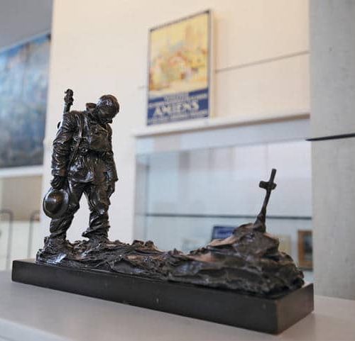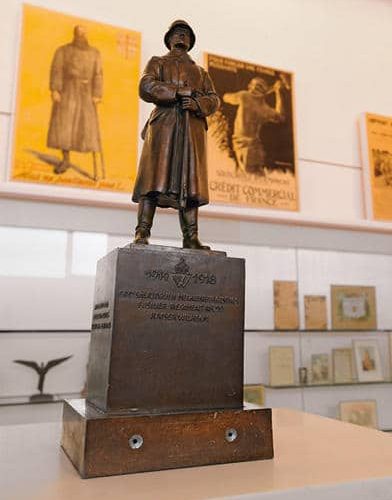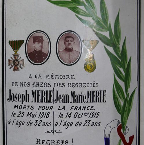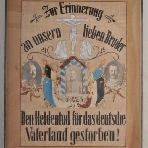 Broderie de deuil bavaroise Sous l’aiguille, un travail du deuil en son sens littéral : ce tableau brodé au décor recherché dévoile le double besoin de commémorer le souvenir glorieux d’un proche mort à la guerre et d’exhiber la douleur de la perte. Dans l’inscription au fil noir (« En souvenir de notre frère bien-aimé mort en héros pour la patrie allemande !»), les mots « patrie » (« Vaterland ») et mort (« gestorben ») ont ainsi été soulignés d’un fil d’argent. Au centre du canevas figure une photographie du défunt en uniforme, mise en valeur par un riche décor de cire représentant une guérite peinte aux couleurs de la Bavière et garnie des drapeaux de l’Empire allemand et du royaume. Dans leurs médaillons décorés de fougères et d’edelweiss, les photographies de Guillaume II et de Rupprecht (prince héritier de Bavière et commandant du 6e corps d’armée) encadrent le défunt, manifestant la double fidélité de cette famille – fidélité monarchique et impériale, fidélité bavaroise et nationale – alors qu’un Christ en croix et deux anges éplorés – simples décors de métal argenté – semblent pencher leur visage vers le disparu. Le dispositif semble suggérer une double intercession, sous le signe syncrétique de la foi et du patriotisme.